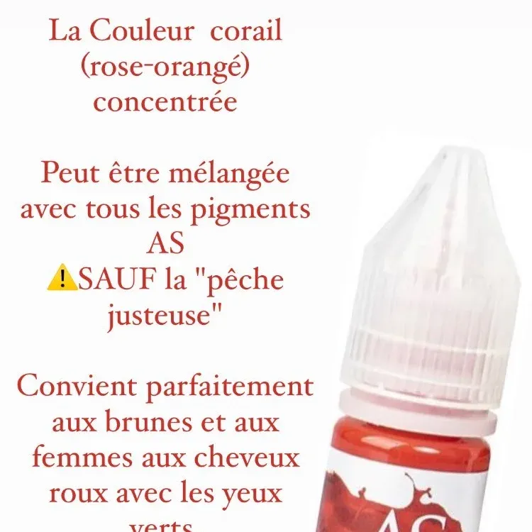 AS Coral : Rose orangé concentré, chaud, adapté aux lèvres foncées et compatible avec d'autres pigments AS lèvres, sauf Juicy Peach.